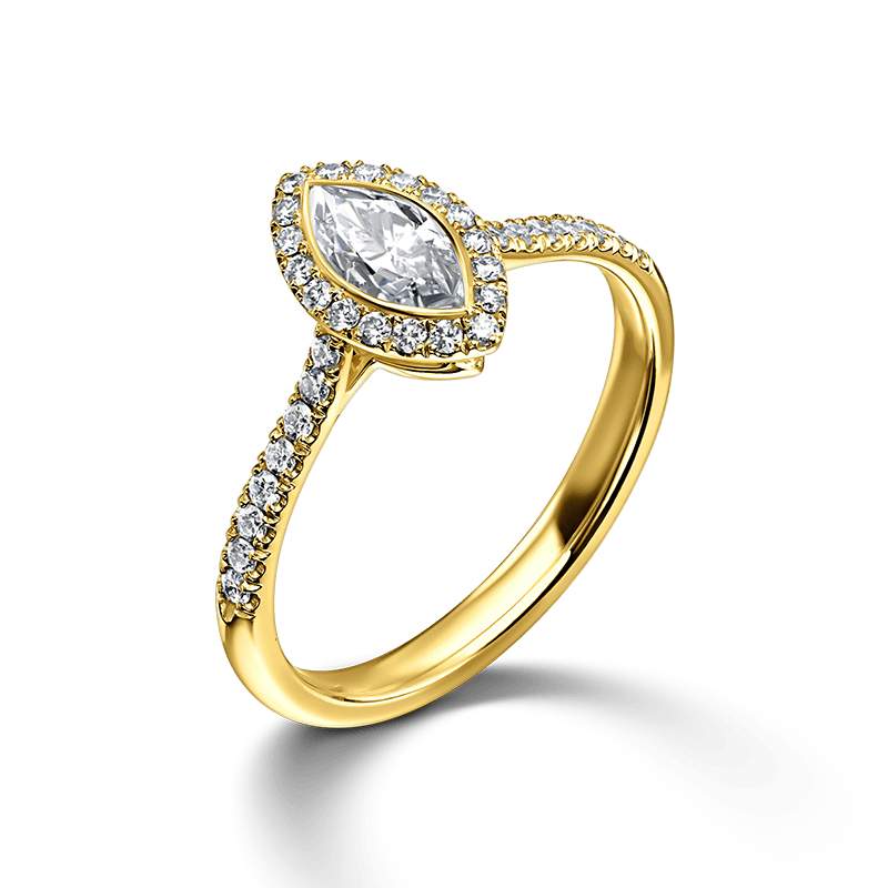 טבעת אירוסין זהב משובצת יהלום טבעי ומנצנץ בחיתוך מרקיזה ויהלומים עגולים טבעיים
