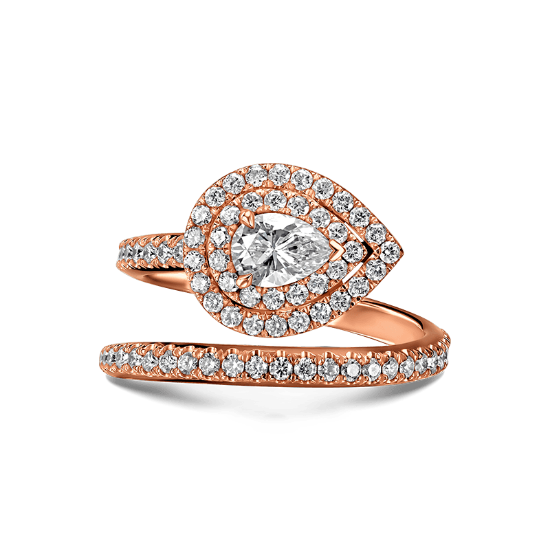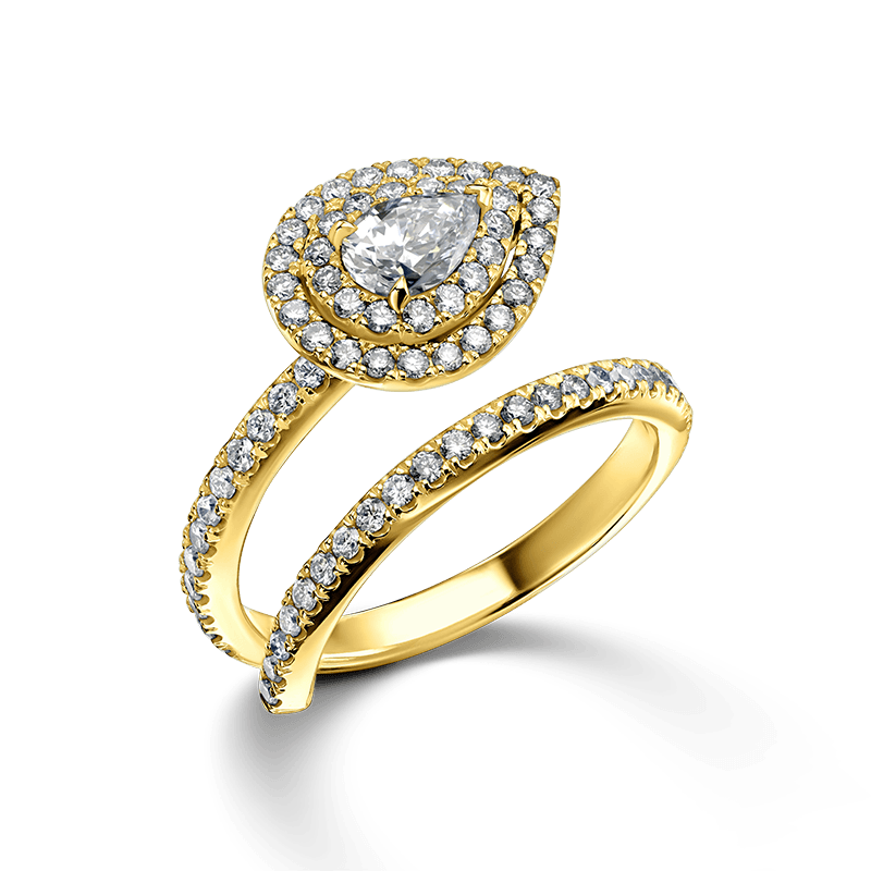 טבעת אירוסין זהב משובצת יהלום טבעי ומנצנץ בחיתוך טיפה ויהלומים עגולים טבעיים